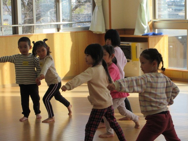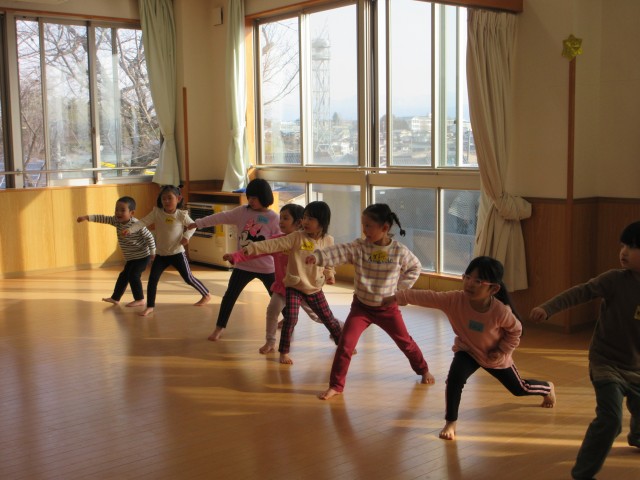 簡単そうでなかなか難しいおしり歩きやクマ歩き。子どもたちは楽しそうに参加し、しっかり体を動かしていました。