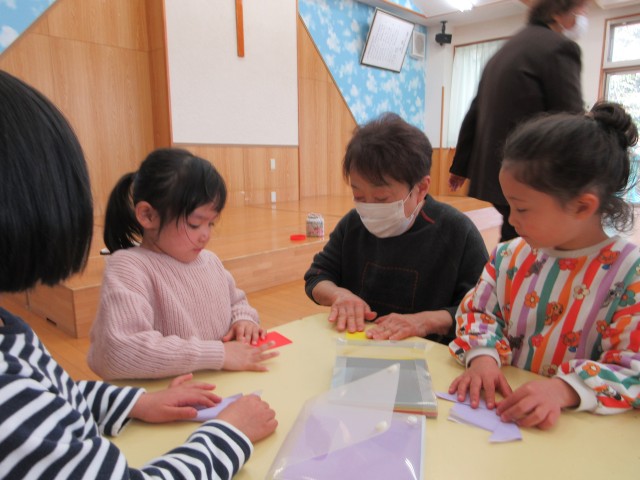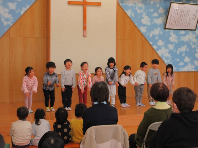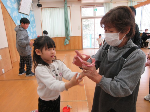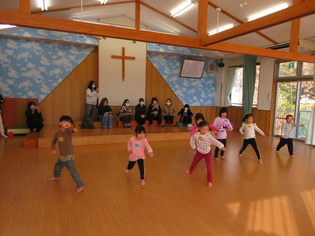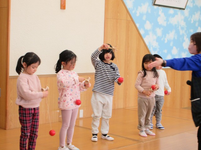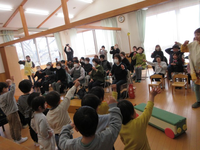 16名の方々が保育園に来て下さり、子どもたちは歌やダンス、コマやけん玉の技を発表しました。