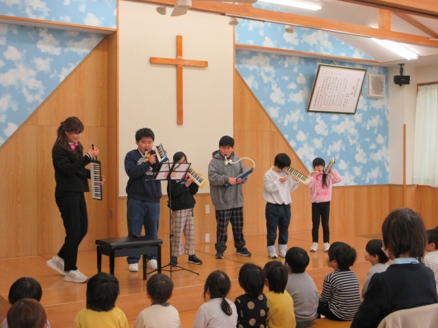 特別ゲストに松川中央小学校のなぎ組のお兄さんとお姉さんを迎え、鍵盤ハーモニカの演奏をして頂きました。“カントリーロード”など7曲をメドレーで演奏して下さり、子ども達は最後まで楽しみながらよく聴いていました♪