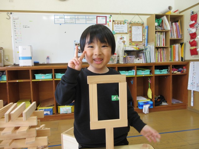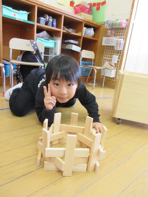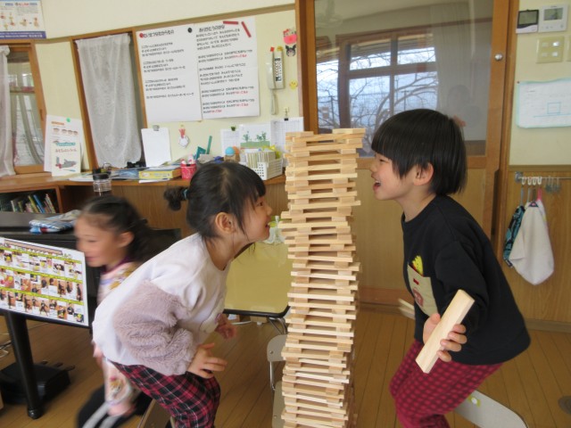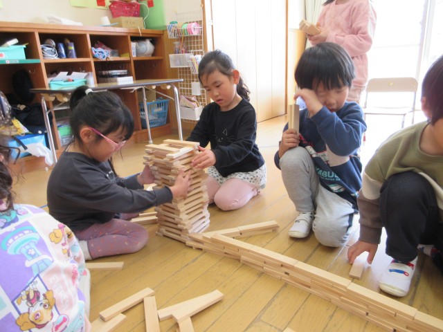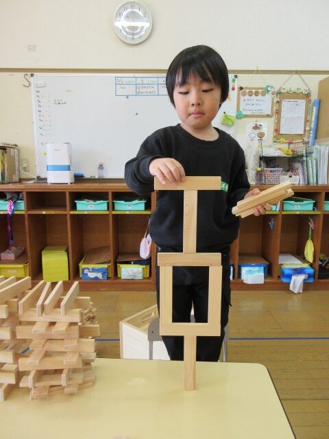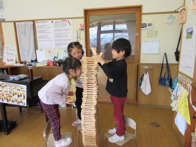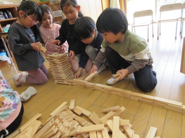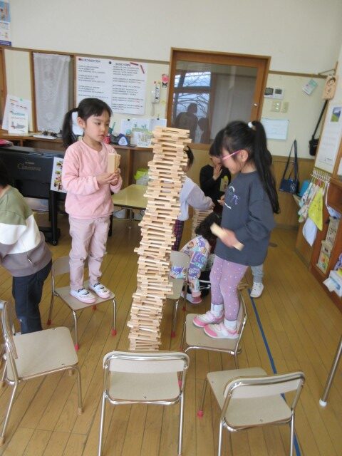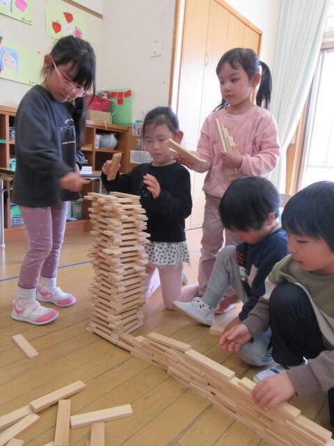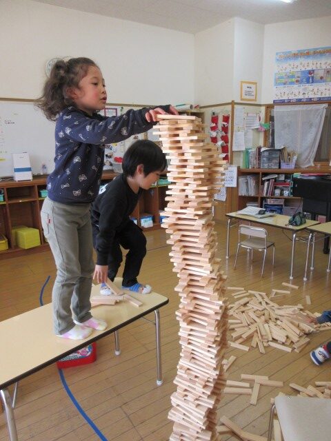 友達と協力しながら、自分たちの身長より高く積んで楽しんでいる姿も見られています。